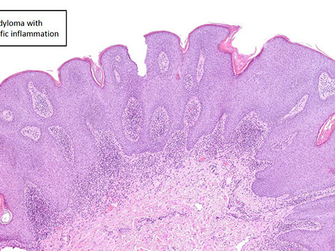- overlying epidermis can get hyperkeratotic and sometimes papillomatous that can look like warts clinically