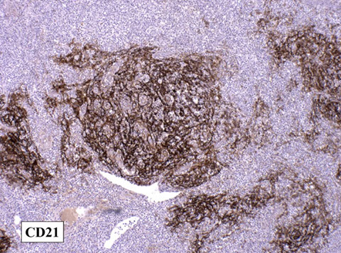 May be positive for CD21, CD23, CD35, clusterin, vimentin, fascin, HLA-DR, EMA, CD68