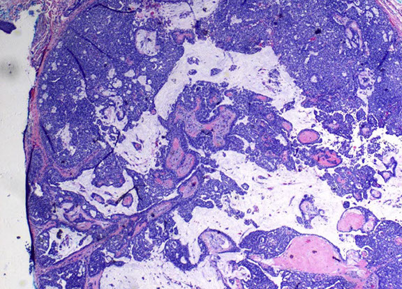 Early - well circumscribed solid lobules of large pale sq cells c little keratinization; mild atypia and distorted follicular infundubuum