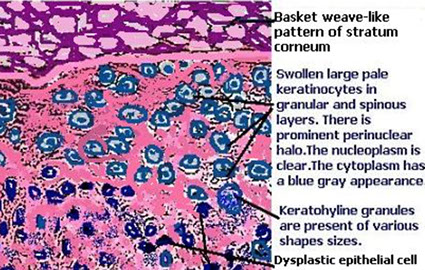 Verruca vulgaris - Prominent granular layer (red), hyperkeratosis (blue) papillomatous hyperplasia (green), inward bending of rete (yellow)