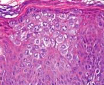Micro: central cystic space with radiating pseudovilli made by acantholytic dyskeratosis
