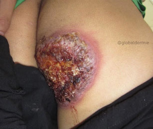 - presentation is usually verrucous lesion in extremities of adult men in outdoor work
