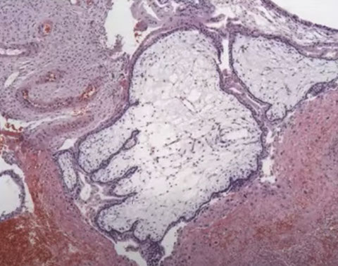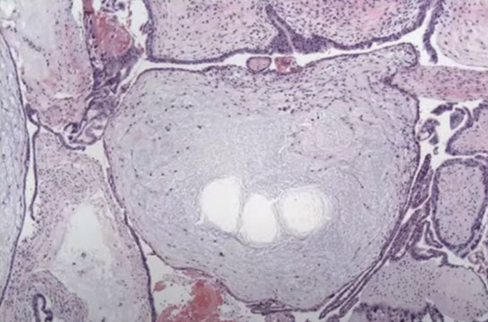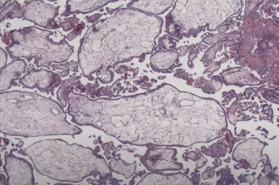 Characteristic findings in CHM with cavitation and absence of fetal vessels. Note the contents completely degenerating and filled with protein rich fluid on the left.
