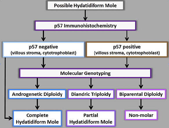 - negative p57 (loss of expression in villous stroma and villous cytotrophoblast, bc is a paternally imprinted gene transcribed from a maternal allele)