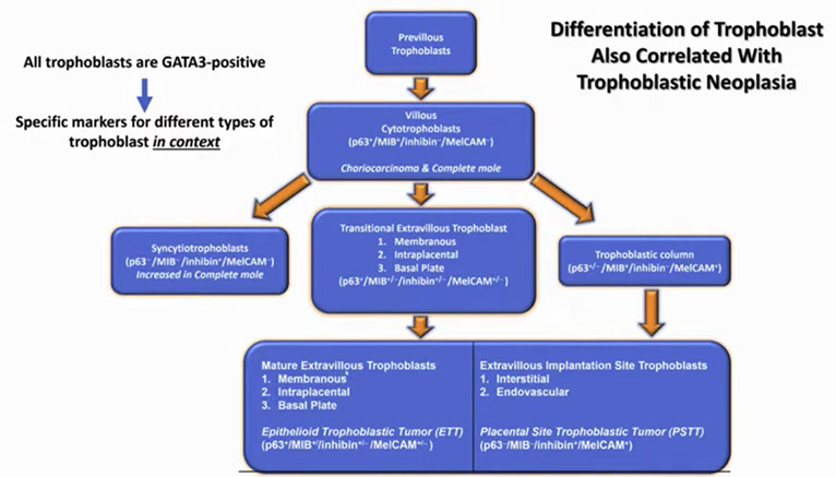 IHC: (+) hCG (stronger than partial, less than choriocarcinoma), p53, CK, Inhibin, HLA-G