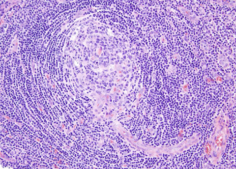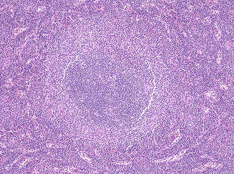 A classic case of SMZL, at higher mag, see the darker central core with lighter marginal zone, with a larger number of smaller lymphs with less cytoplasm in the central cords, here there are too many lymphocytes in the red pulp to be considered normal