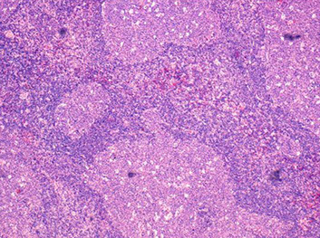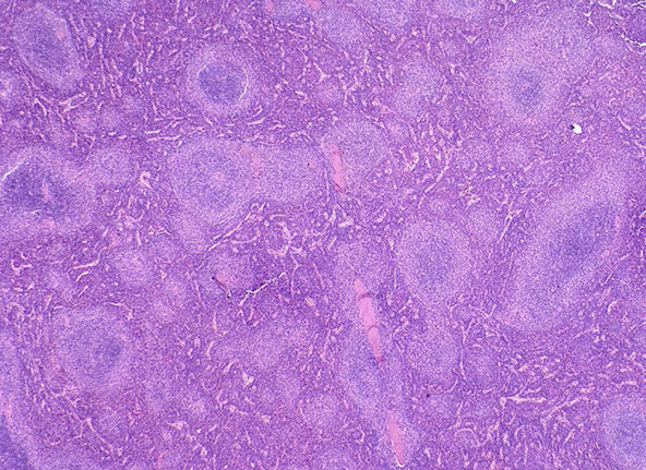 A classic case of SMZL, with increased and enlarged white pulp nodules, with dark central cores and paler peripheral marginal zones, also infiltration of the red pulp with little nodules and cells in the cores.