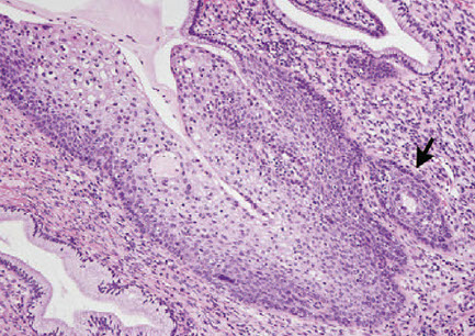 - may undergo squamous epithelialization where squames go under glands and push them up and out; or can undergo squamous metaplasia where endothelial reserve cells proliferate