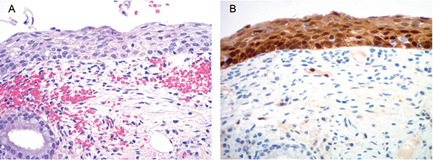 IHC: Ki67 <20% in basal 1/3, <5% in middle 1/3 and absent in superficial cells (vs in SIL)
