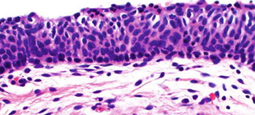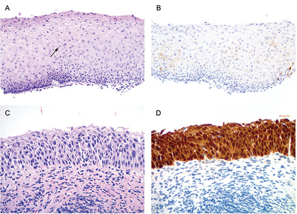 -- immature squamous metaplasia may look dysplastic, bc the cells have inc NC, lack maturation, and are hyperchromatic, but they are also relatively uniform c smooth nuclear contours (a Ki67 may help to differentiate [<15% in basal / surface cells of squamous metaplasia])