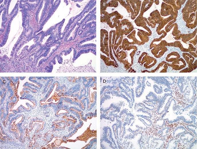 - IHC: (+) CK7/20, CDX2, CEA (focal), p16 (focal or neg)