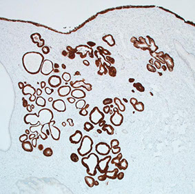-- basal layer: dense chromatin in picket-fence pattern which are mitotically inactive and are Ki-67 neg