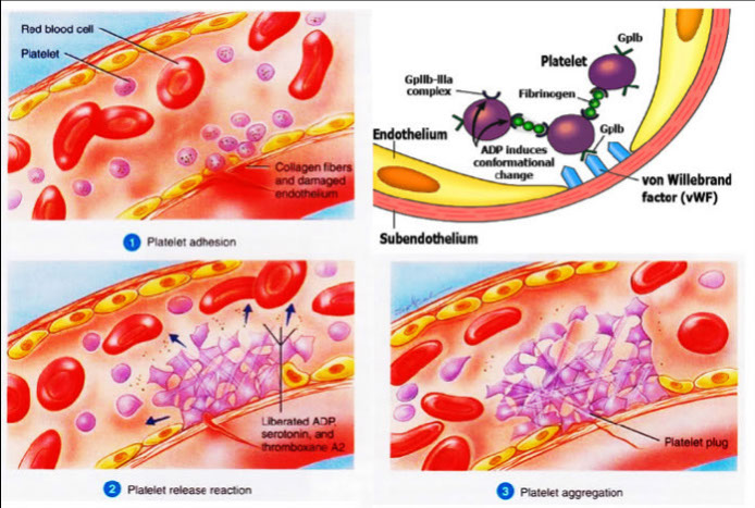 - Soluble adhesive proteins: fibrinogen; fibronectin; thrombospondin; B-thromboglobulin; von Willebrand Factor (vWF)