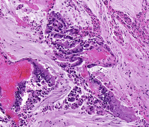 Micro: pencillate nuclei, lots of necrosis, assoc c adenoma