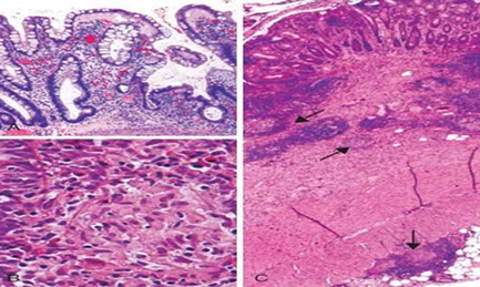 - subspithelial tissue c bizarre MNGCs and mast cell infiltrates