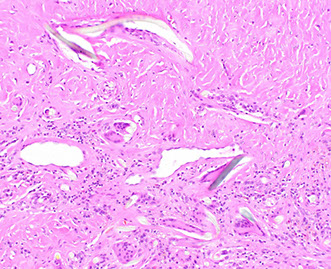 Rectal angiokeratoma. Note the dilated vascular spaces present within the squamous epithelium