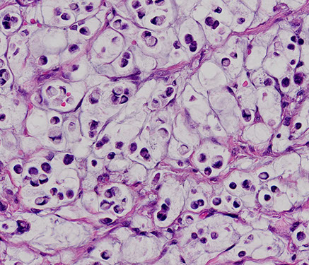 - abundant pink granular cytoplasm; (+) S100, CD68 and calretinin
