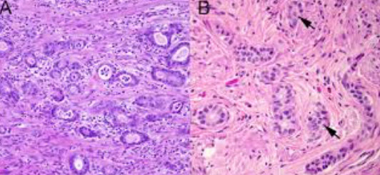 1) anal gland adenocarcinoma (The term “anal duct adenocarcinoma” is discouraged.) These cancers arise in anal glands/ducts and therefore do not originate from a mucosal precursor. They can have a somewhat unique morphology, with rounded nuclei, amphophilic cytoplasm, and anastomosing glands. Cribriforming architecture and scattered, dispersed glands have also been reported.