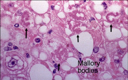 Mallory bodies are an accumulation of intermediate filaments and other proteins – visible as eosinophilic cytoplasmic inclusions in degenerating hepatocytes