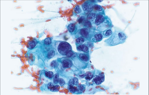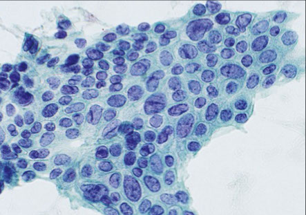 - oval to round shape c scanty, poorly preserved cells, transparent or basophilic cytoplasm c ill-defined borders