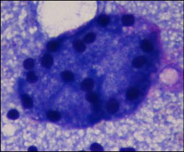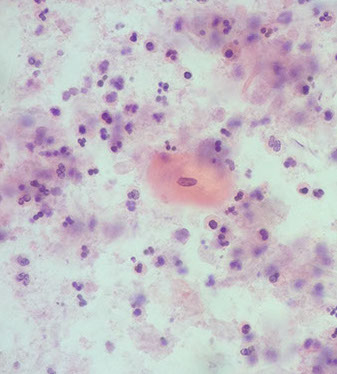 Dispersed single cells and loose clusters, prominent nuclear inclusions that can be confused with herpest