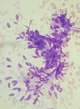 Cytology: Large round, oval or spindle shaped cellsVescicular chromatin with prominent nucleoliPale, fragile cytoplasmNumerous bare nuclei Syncytial –like arrangementsBackground of lymphocytes and occasional plasma cells