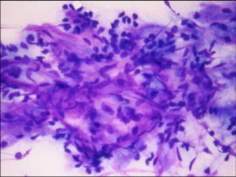 Myxoid stromal fragments appear metachromatic in Diff-Quik type stains