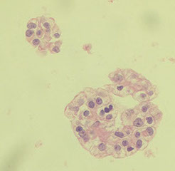 -Aspirates appear normal except acinar cells are significantly larger than normal and inflammatory cells tend to be absent.