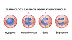 CD Marker: CD15; Size: 10-16 µm; N:C ratio: 1:1-1:2; Nucleus indented and > 1/2 diameter; Thick bridge of chromatin separating lobes; Chromatin & parachromatin are visible; Nuclear chromatin dark, condensed, bluish-purple; Cytoplasm pink-clear; Specific granules present