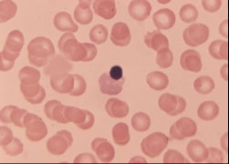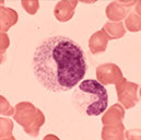 CD Markers-CD45RA; Size: 10-18 µm (close to a mature cell); N:C ratio 2:1; Nucleus may be eccentric (less golgi) but is more clumped, less red more blue; No / rare nucleoli (less mitoses); Cytoplasm clear to bluish-pink (still some RNA activity)c 20 granules appear; Specific to N, B, E