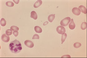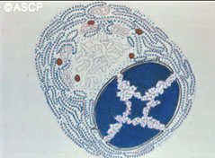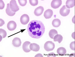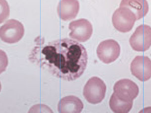 CD Marker: CD15; Size: 10-16 µm; N:C ratio: 1:3; Nucleus c 3-5 lobes separated by thin filament; Dark, clumped; chromatin & parachromatin visible; Cytoplasm c specific granules present