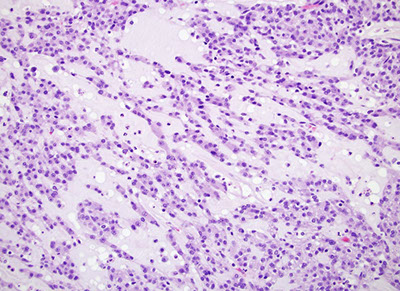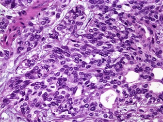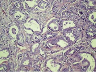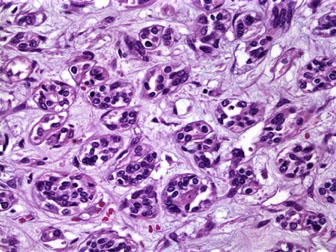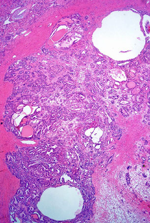 Micro: glandular / tubular / nested formation of dense pink cells c regular round nuclei in background of hypocellular loose CT