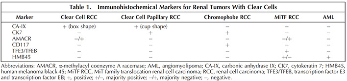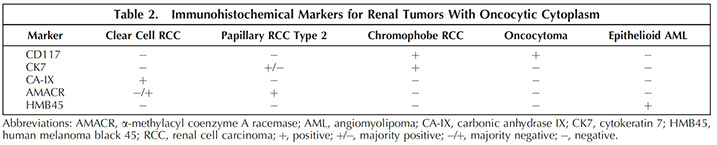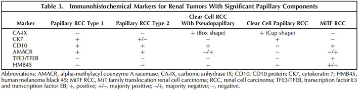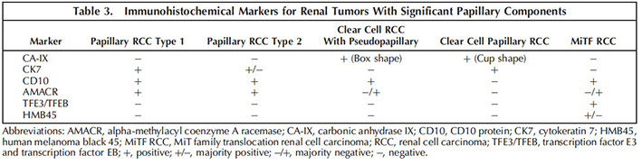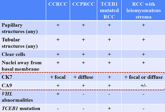 - negative RCC, CD10 (variable), vimentin, Hale's colloidal iron (apical blush ok)