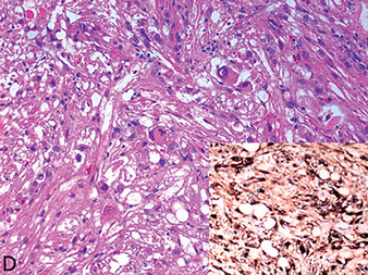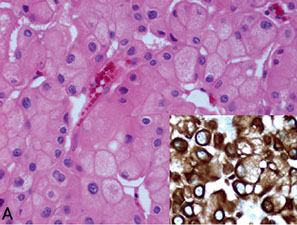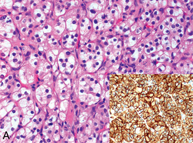 B, Oncocytoma is focally positive for CK7 (inset) in scattered tumor cells [4]