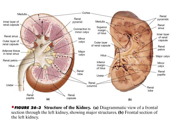 2 kidneys, each broken into cortex and medulla; a renal lobe is the medullary pyramid with the cortical region covering, and is bounded by the renal columns (of Berin) and the apex terminating the a papilla surrounded by a minor calyx