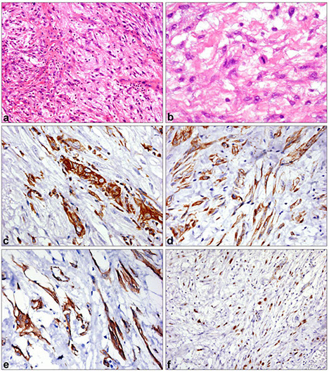 Spindle cell carcinoma. 1a: Spindle cell lesion with myxoid stroma (HE ×200). 1b: Mild to moderate atypia in tumor cells with rare mitoses (HE ×400). 1c: Vimentin immunoperoxidase – strong expression in tumor cells (×400). 1d: Pan-cytokeratin AE1/3 immunoperoxidase (×400). 1e: smooth muscle actin immunoperoxidase (×400). 1f: Proliferation (Ki67) up to 80% (immunoperoxidase ×200). [1]