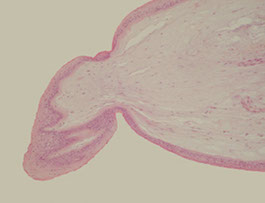 Micro: can have submucosal myxoid material c vascular stroma, fibrous tissue deposition, prominent dilated vascular spaces, and deposition of dense hyaline material / fibrin
