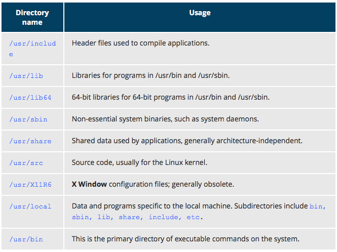 Linux filesystem names are case-sensitive, so /boot, /Boot, and /BOOT represent three different directories (or folders). Many distributions distinguish between core utilities needed for proper system operation and other programs, and place the latter in directories under /usr (think "user"). To get a sense for how the other programs are organized, find the /usr directory in the diagram above and compare the subdirectories with those that exist directly under the system root directory (/).