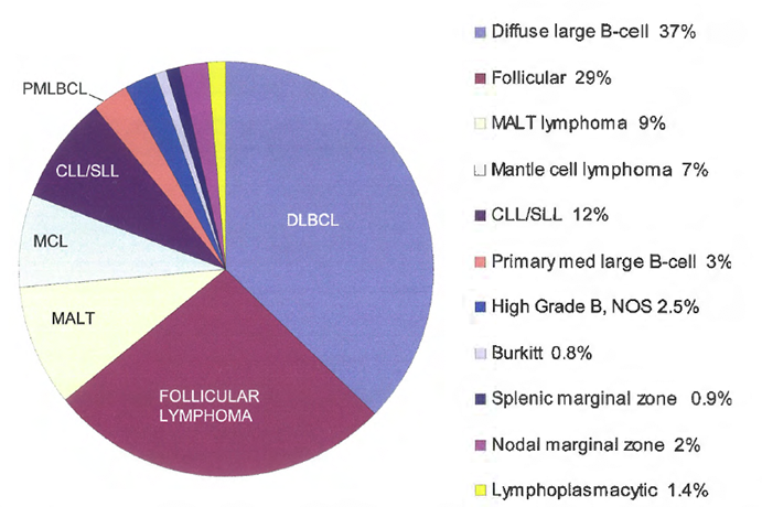 - MC B-cell neoplasms = DLBCL> FL >CLL > MCL