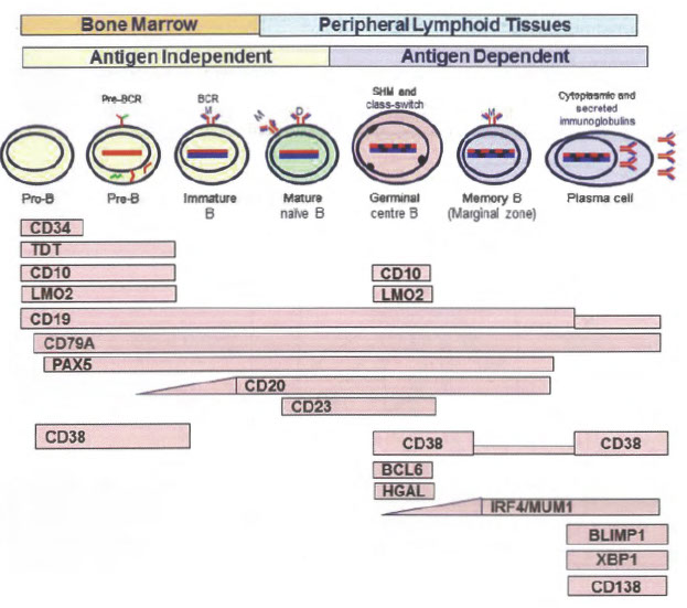 B- and T-cell neoplasms can be classified to some extent by the stage of their maturation