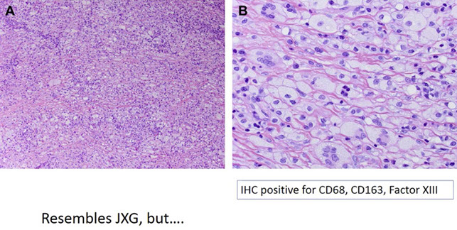 Extensive effacement by cytologically bland foamy histiocytes with interspersed inflammatory cells and multinucleated (Touton) giant cells.