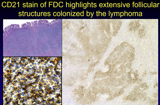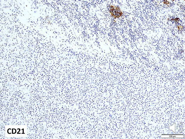 May be positive for CD21, CD23, CD35, clusterin, vimentin, fascin, HLA-DR, EMA, CD68