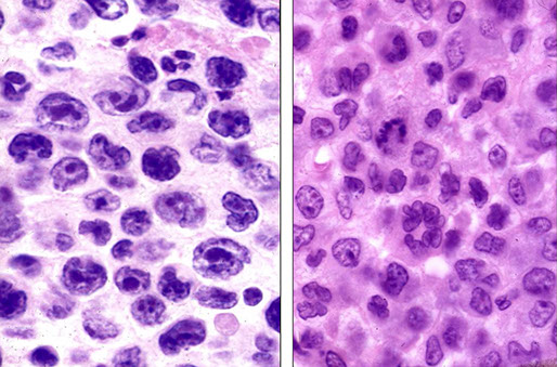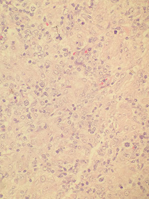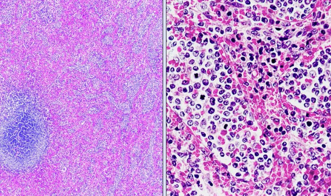 A fairly typical case of follicular dendritic cell sarcoma, with eosinophilic cytoplasm and admixed lymphocytes, (right) nuclei resemble normal FDCs