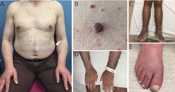 Rare high-grade cancer with crazy-lookin cells, usually in skin and multiorgans of adults c F>M