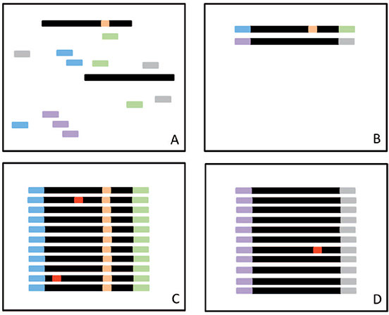 A, Before amplification, random tags (short bars) are added to DNA fragments (black), some of which have a mutation (orange). B, The tags randomly attach to DNA fragments. C, During amplification some copies will develop an error (red). All fragments will be sequenced. Only mutations that are detected within a majority (eg, 95%) of all the sequencing reads with the same ID tag will be identified as true mutations. D, Mutations present in a minority of reads with the same ID tag are considered errors. Reprinted from Yohe SL. Hot topic spotlight— new frontiers in clinical next-generation sequencing. In: Cushman-Vokoun AM, Anderson WB, eds. Precision Medicine Resource Guide. Northfield, IL: College of American Pathologists; 2016:5. With permission