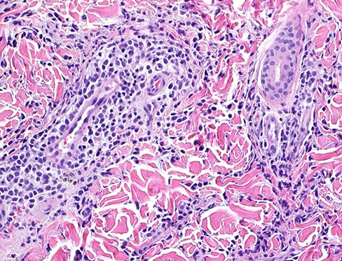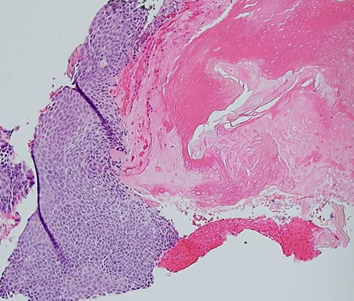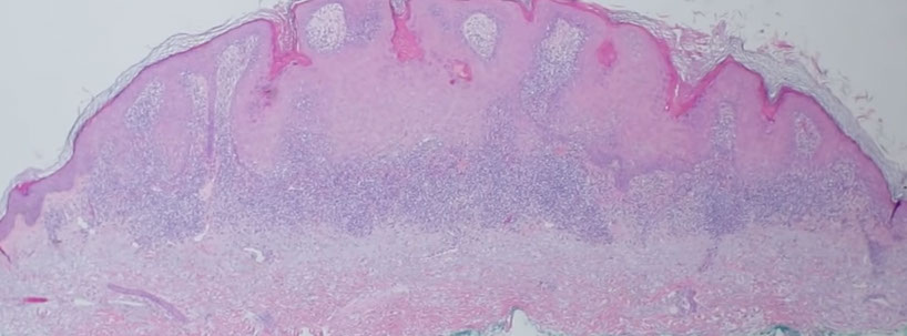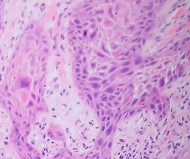 - also larger and more atypical squamous nests and islands c lots of lichenoid inflam and eos but no plasma cells; possible neutros microabscesses