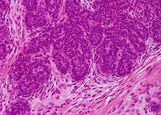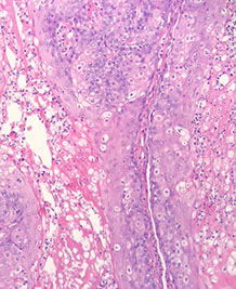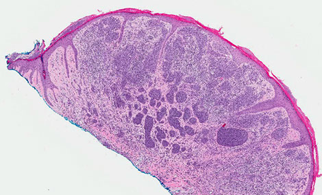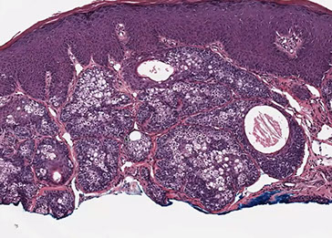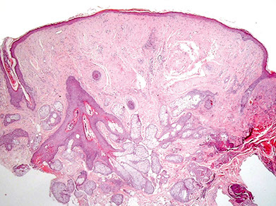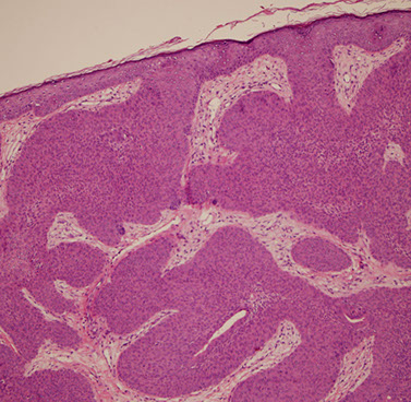 Early - well circumscribed solid lobules of large pale sq cells c little keratinization; mild atypia and distorted follicular infundubuum