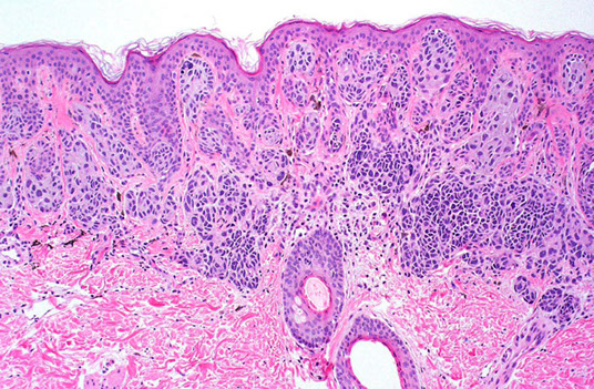 Micro: contiguous proliferation of lentiginous melanocytes with areas of confluent nesting