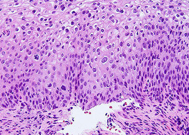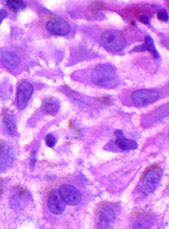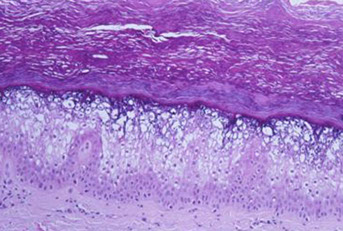 Stratum Basalis - where stem cells reproduce squamous cells, pushed upward; pink bc filled c keratin