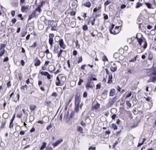 Micro: necrotizing granuloma of subcutis c spherical organisms c central basophilia, internal septation and double layer walls